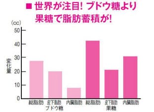 被験者を2群に分け、一方はエネルギー比25%の高果糖飲料を、もう一方はブドウ糖だけを使用した飲料を10週間飲み続けてもらった。皮下脂肪、体脂肪、総脂肪の変化を分析したところ、果糖群で明らかに内臓脂肪、総脂肪が増加した(データ:Stanhope KL et al. J Clin Invest119:1322-1334)